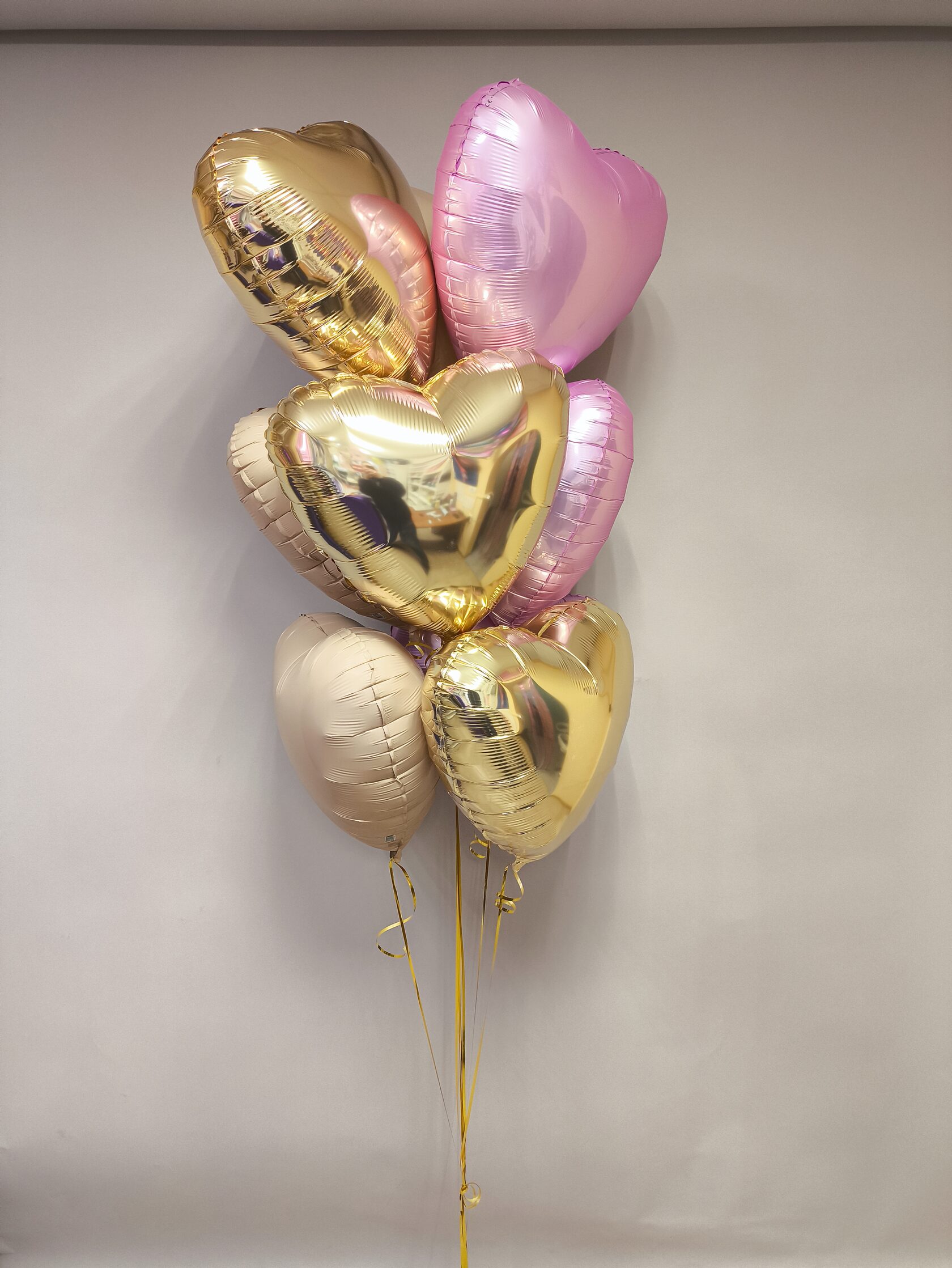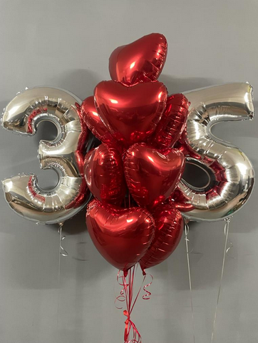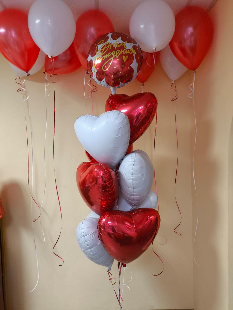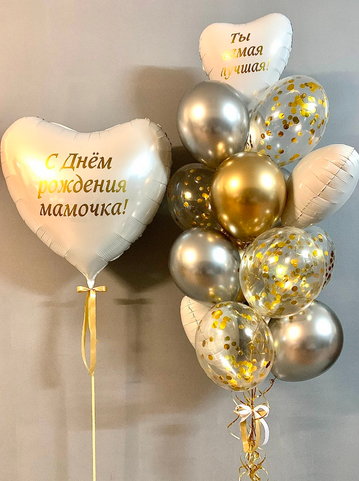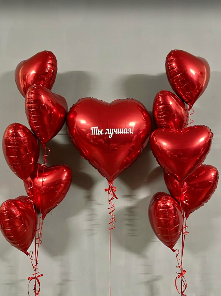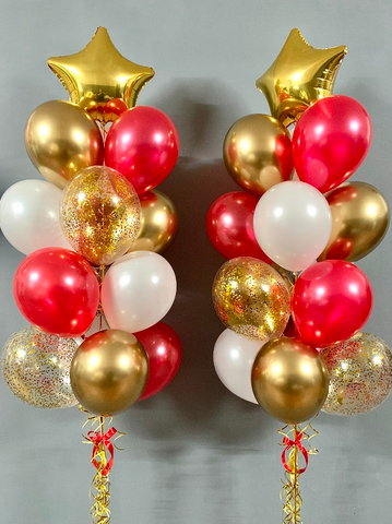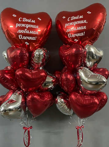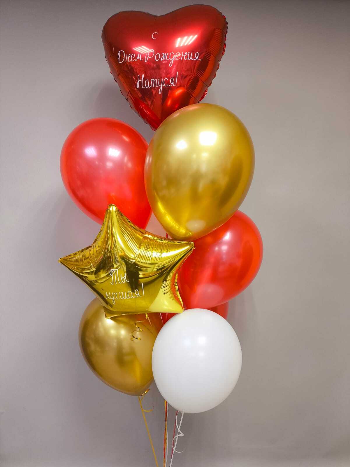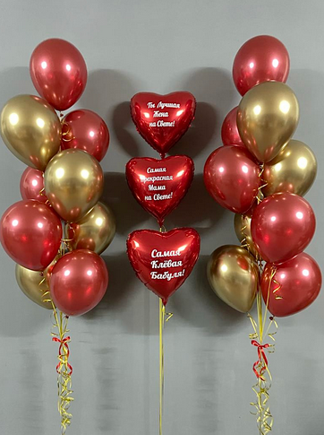 -Шар Звезда 18"/45см с индивидуальной надписью 1шт -Шар Сердце 18"/45см с индивидуальной надписью 1шт -Шары Хром золото 2шт -Шары красные металлик 3шт -Шары белые пастель 3шт