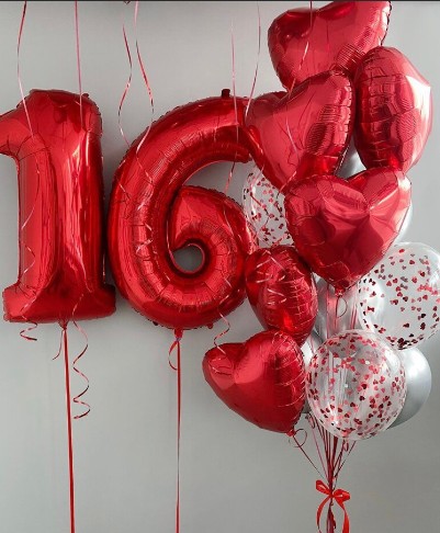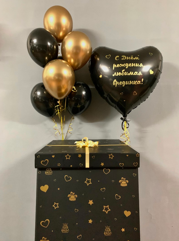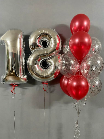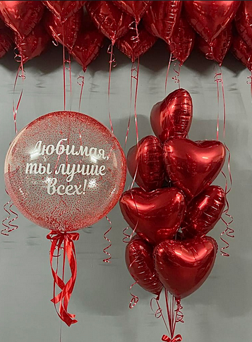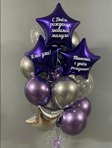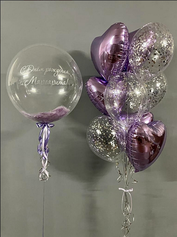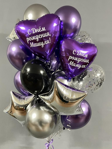 -Шар Сердце 32"/81см с индивидуальной надписью 1шт -Шар Звезды 18"/45см с индивидуальной надписью 1шт -Шар Звезды 18"/45см 2шт -Шары Хром 8шт -Шары с конфетти 5шт -Бантики